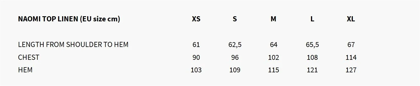 fi/ Kevyt, vaivaton ja monikäyttöinen. Naomi Top on valmistettu pellavasta, ja sen ilmava siluetti on suunniteltu lämpimiin päiviin ja ajattomaan tyyliin.
